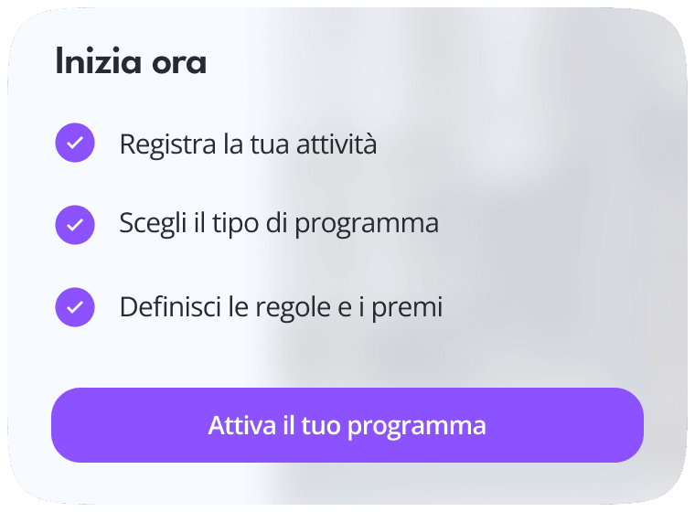 Attiva la tua soluzione fedeltà senza costi iniziali, direttamente da app. Nessun hardware, nessuna complessità.